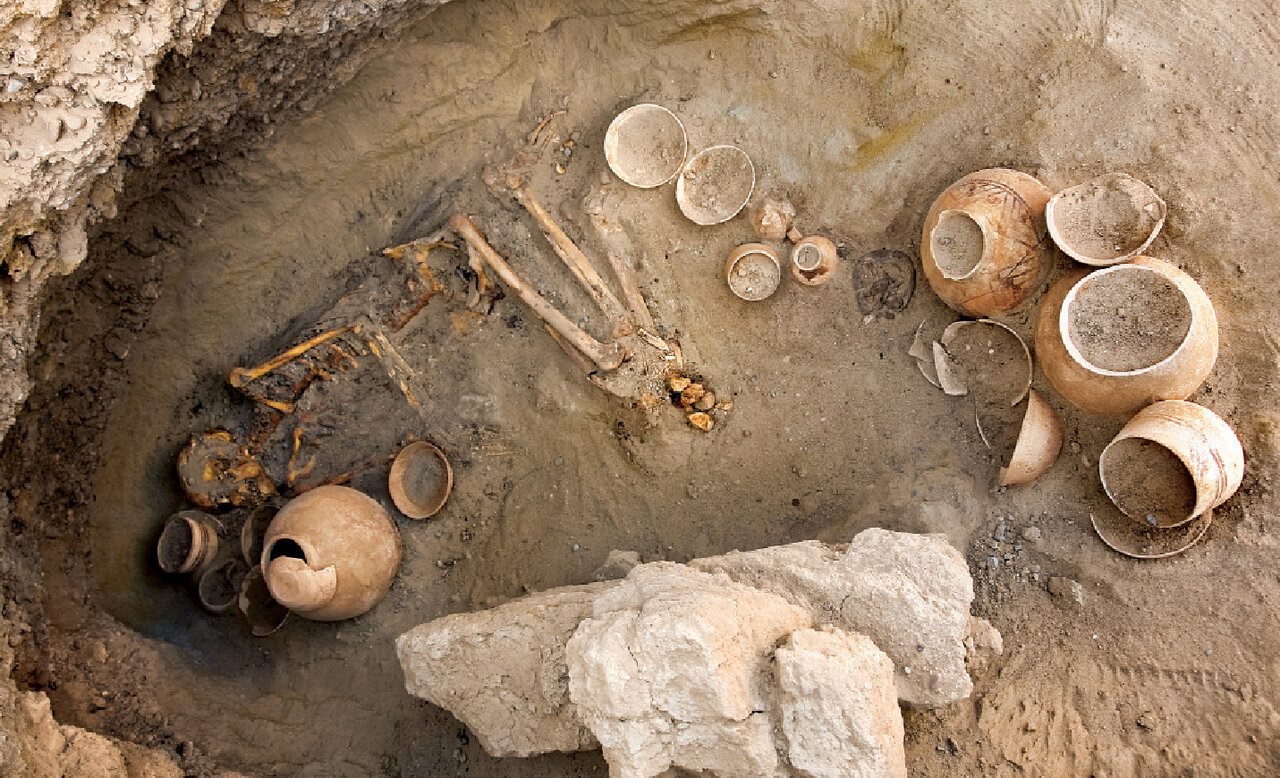 در کنار اجساد، اشیایی مانند ابزار کار، ظروف سفالی، زیورآلات، اسباببازی و مواد غذایی یافت شدند که نشان از باور به زندگی پس از مرگ و وجود ساختار طبقاتی اجتماعی دارد. جهتگیری برخی گورها به سمت خورشید نیز با آیینهای خورشیدمحور مرتبط دانسته شده است.